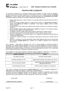 L’esigenza di Qualità totale e di miglioramento continuo dei prodotti e servizi resi al Cliente sono sempre state oggetto di attenzione da parte di C.S. COATING SYSTEM, infatti tra le prime attività volute dalla Direzione è stato il raggiungimento della più aggiornata certificazione secondo Sistema Qualità UNI EN ISO 9001;2015 ottenuta ad ottobre 2017.